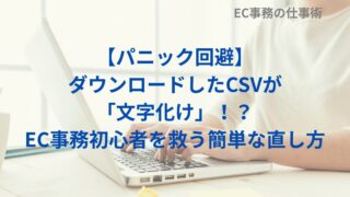 EC事務の仕事術 【パニック回避】ダウンロードしたCSVが「文字化け」!?EC事務初心者を救う簡単な直し方 EC事務のお仕事で頻繁に扱う「CSVファイル」。いざExcelで開いてみたら、日本語の部分が「縺ゅj縺」のような謎の記号だらけになっていてパニックになった経験はありませんか?「私がデータを壊しちゃった!」とクライアントに泣きつく前に、自力でサクッと直せる簡単な文字化け解消法を解説します。 2026.04.09 EC事務の仕事術
